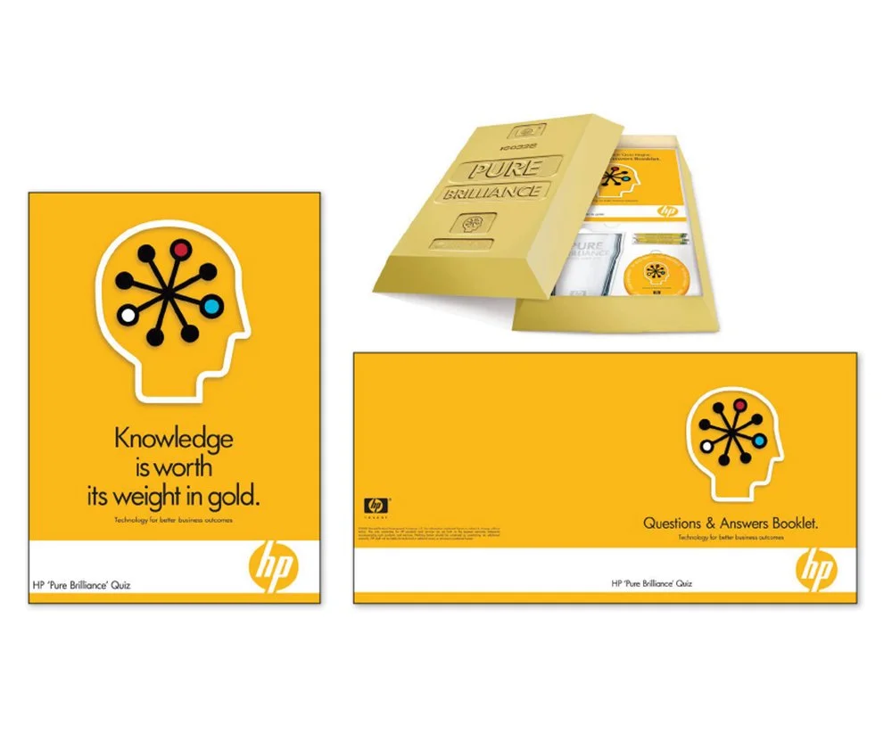 A pub quiz kit in a box and a sales tool for HP’s partners (people who sell HP products – in this case, servers and operating systems) so they can run quizzes with their customers. The proposition is that Knowledge (of HP’s server operating system – HP-UX) is worth its weight in gold, and hosting a quiz is a good way to remind customers. The box is a metallic ink model of a gold bar, with embossed details on top. It contains a laser-etched beer glass, branded beer mats, pencils, a book for questions and answers, and answer sheets.